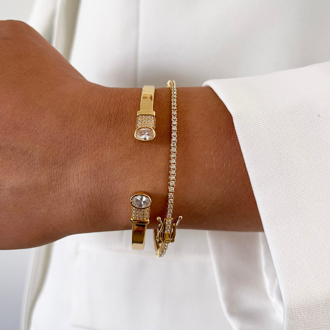 Diana Bangle armbåndet er et tidløst og elegant statement-piece, der kombinerer klassisk design med funklende detaljer. De skinnende zirkonia-sten fremhæver armbåndets polerede finish og giver et sofistikeret udtryk. Brug det alene for et minimalistisk og eksklusivt look, eller kombiner det med dine andre favoritsmykker for en mere personlig og iøjnefaldende stil.