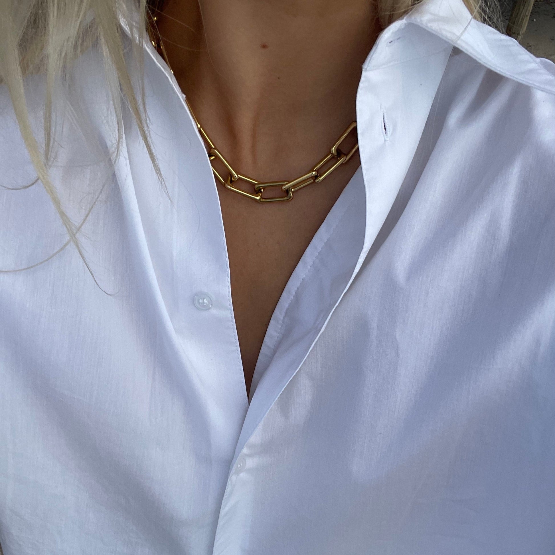 Vores link halskæde er en chunky, men elegant kæde, der giver dit outfit et markant og stilfuldt boost. Den smarte, usynlige lås kan fastgøres til ethvert led på kæden, hvilket giver dig frihed til at justere længden og skabe præcis det look, du ønsker. Brug den kort og tæt på halsen, som en længere kæde eller som en trendy Y-kæde – stylingmulighederne er uendelige.